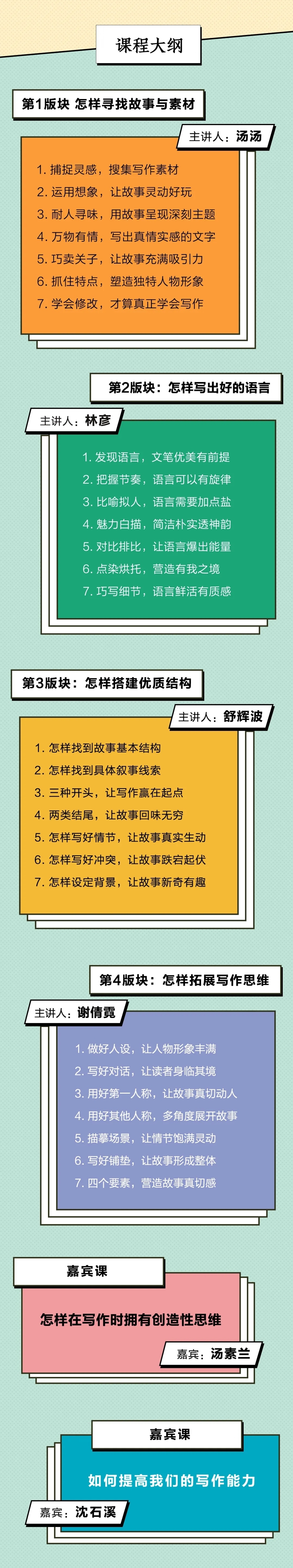第一版块,搭建故事与素材。阅历少,肚中无货,写不出东西?汤汤老师将鼓励孩子用善于感受的心捕捉素材、用想象力加工素材,通过对生活观察的自由表达,充分体会写作的美妙滋味。